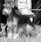 Хочется остановиться на А-Чипе. Шоколадные собаки во многих породах появились позднее основных окрасов и слабее в экстерьерном плане. А-Чип был (в 2004 году он погиб) красавцем с крепким корпусом, с хорошо выраженной холкой, компактным, с длинной головой. Следует признать, что "шоколад" был "молочным", но это не помешало ему дать детей с хорошим темно-шоколадным окрасом. А-Чип много выставлялся, неизменно с оценкой "отлично" и титулами. Вершиной была Национальная выставка "День цвергшнауцера - 2001" 26.05.2001 г. в Москве. Под экспертизой Петра Круля (Польша) он стал лучшим представителем породы (интересная статистика на этой выставке: 2 белых цверга - признанный окрас, и 8 шоколадно-подпалых).