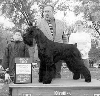 Одна из моих первых выдающихся шоу-собак - BISS Am, PR, Can, Int Ch Keystone’s Shaq Second Chance (Шек). Он был получен при вязке Keystone's Wildthing v. Monaco (или Пепси, как мы ее звали) с испанским импортом Сильвии Хаммастрем по кличке Raja de Pichera (Раджа). Раджа был очень правильным кобелем, но немного меньшего размера, чем я предпочитаю. У Пепси и Раджи было 4 чемпиона в этом помете: Шек, Ch. Keystone's Geronimo Wildman, Ch. Keystone’s Black Knight CD и Ch. Keystone's Mayas Wild Hatten. Шек, его брат и племянница учавствовали в Чемпионате Мира в Пуэрто Рико в 1997 году. Шек выиграл титул “Чемпион Пуэрто-Рико” (PR) в этой поездке. В 1999 году Шек, будучи выставлен владельцем, заработал титул Кобель № 1 и Ризеншнауцер № 2 по системе оценок GSCA (Ризеншнауцер-клуб Америки). Он был приглашен участвовать на Westminster Шоу в феврале 2000 года (очень престижное, главное шоу года Америки, где принимают участие только собаки-чемпионы) и там тоже выступил очень хорошо. За нескольких лет он выиграл несколько выдающихся наград на наших специализированных выставках и был конкурентно способен в ветеранах в 2003 г.